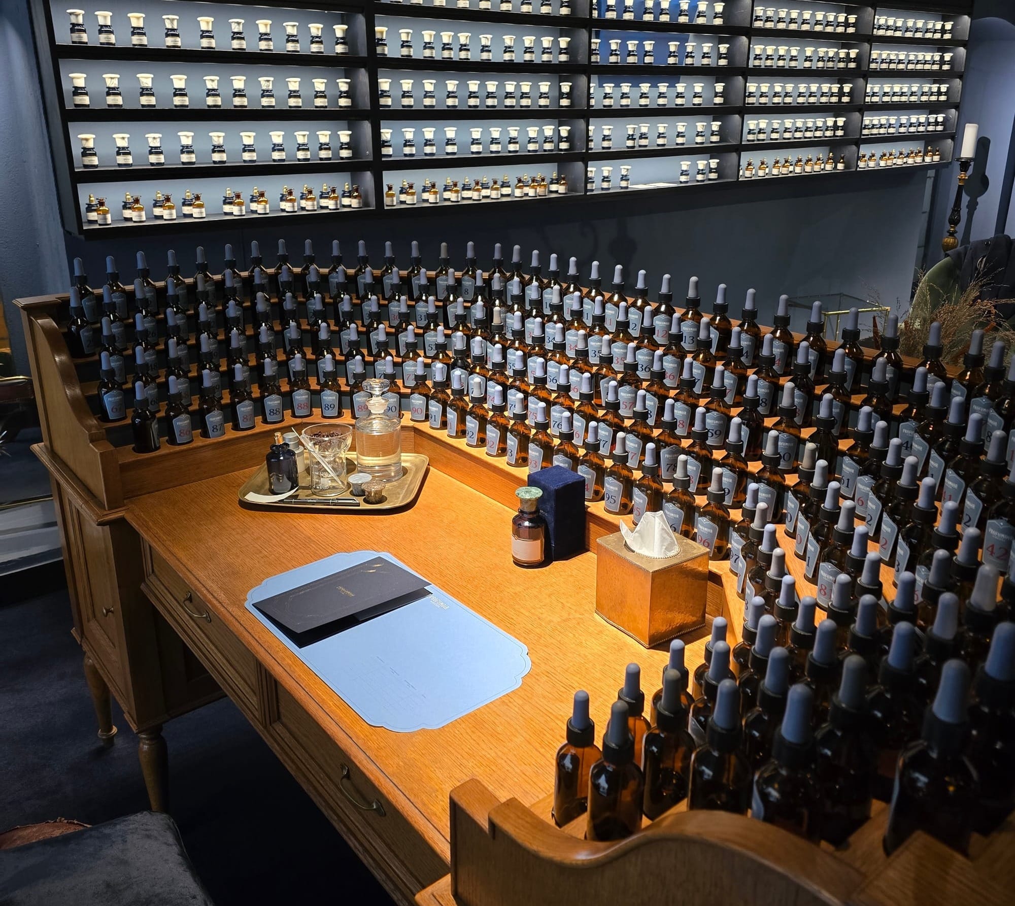 Zurück im Laden nahm einer von uns Platz an der Parfumorgel – ein kunstvoll arrangierter Tisch, bestückt mit einer Vielzahl von Parfumfläschchen. Jedes Fläschchen war im Design identisch, aber einzigartig im Duft, was eine nahezu hypnotische Wirkung erzeugte. Die Flakons waren präzise angeordnet und nummeriert, um Neutralität zu gewährleisten und Vorurteile gegenüber Düften bei offener Benennung zu vermeiden. Die Einheitlichkeit der Fläschchen schuf eine faszinierende Textur, fast wie eine harmonische Komposition von Möglichkeiten – eine geniale Methode, die unsere Aufmerksamkeit ganz auf die Düfte lenkte, frei von vorgefassten Meinungen.