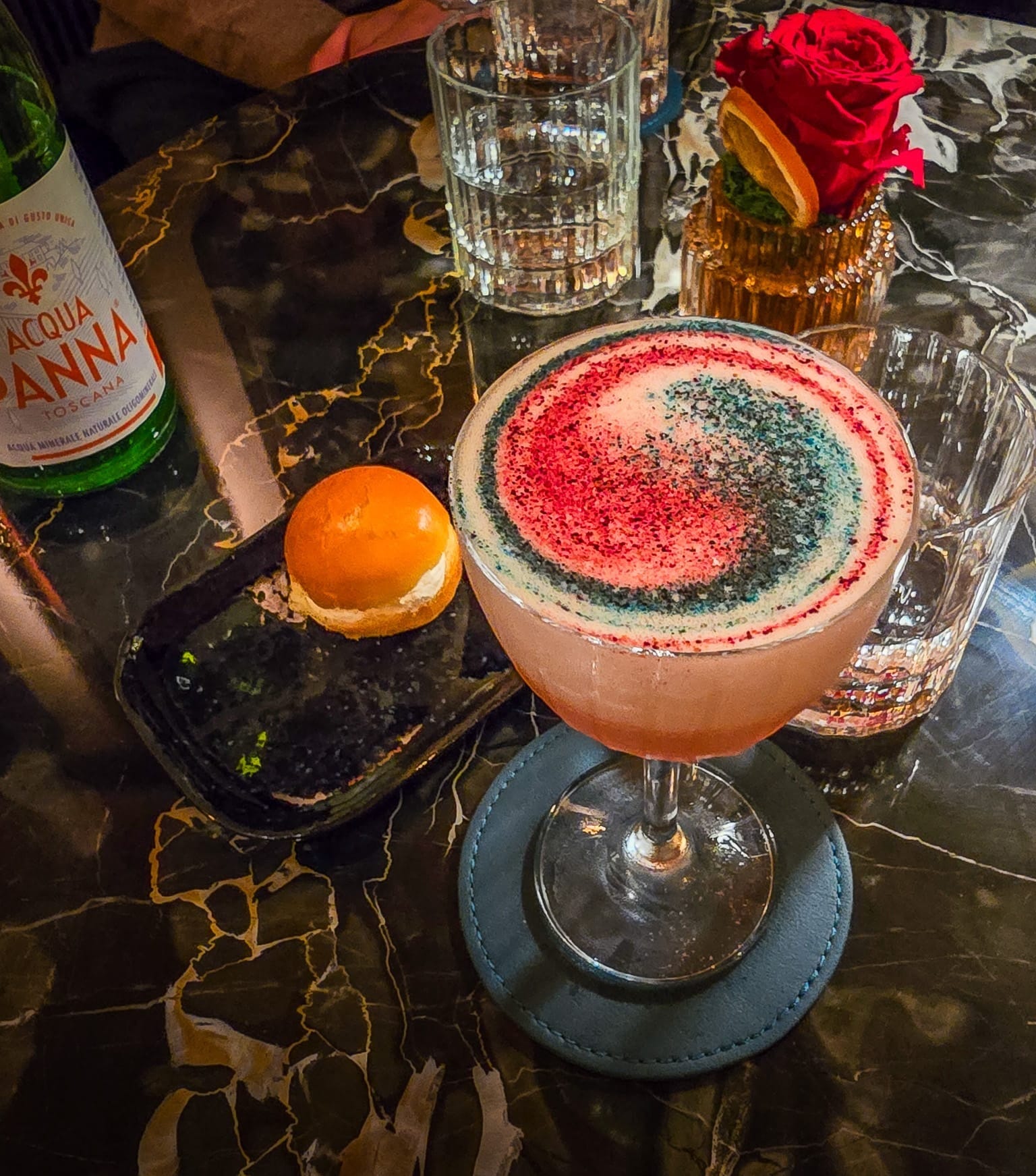 Dazu wurde ein kleines Brioche mit Robiola Käse und Trüffel gereicht. Das Brioche mit der mild-säuerlichen Note des Robiola und der leichten Trüffel-Note hat den Drink geschmacklich perfekt ergänzt.