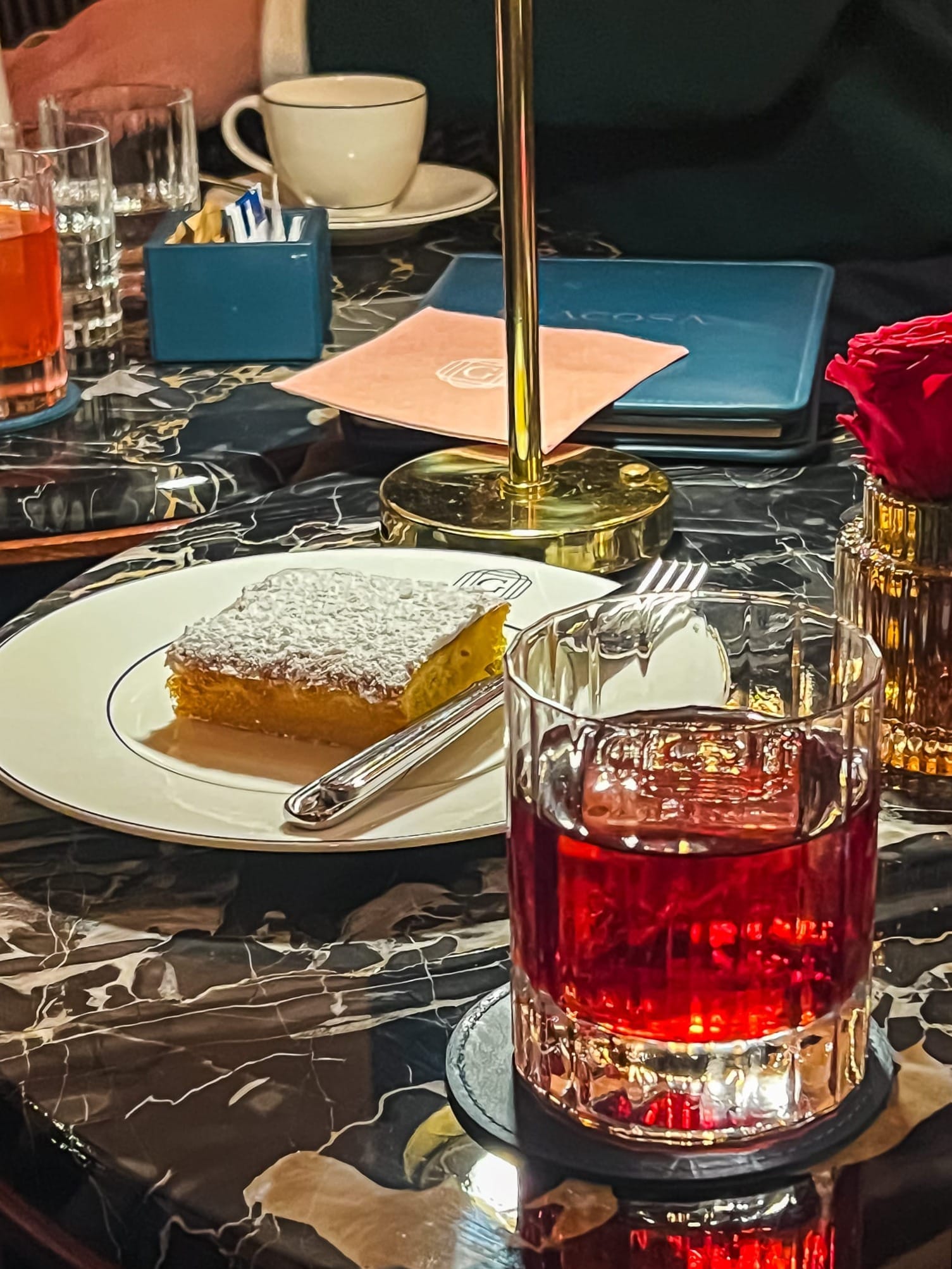 Neben dem obligatorischen klassischen Negroni Giacosa, hat die von Luca Manni, dem Bar Manager der Valenza-Gruppe, kreierte Karte noch einige kreative Negroni Abwandlungen zu bieten wie den Negroni Brulèe oder den Cosmo Negroni. Ins Auge sticht auch der Negroni Tee, der für Teeliebhaber eine echte Empfehlung ist.