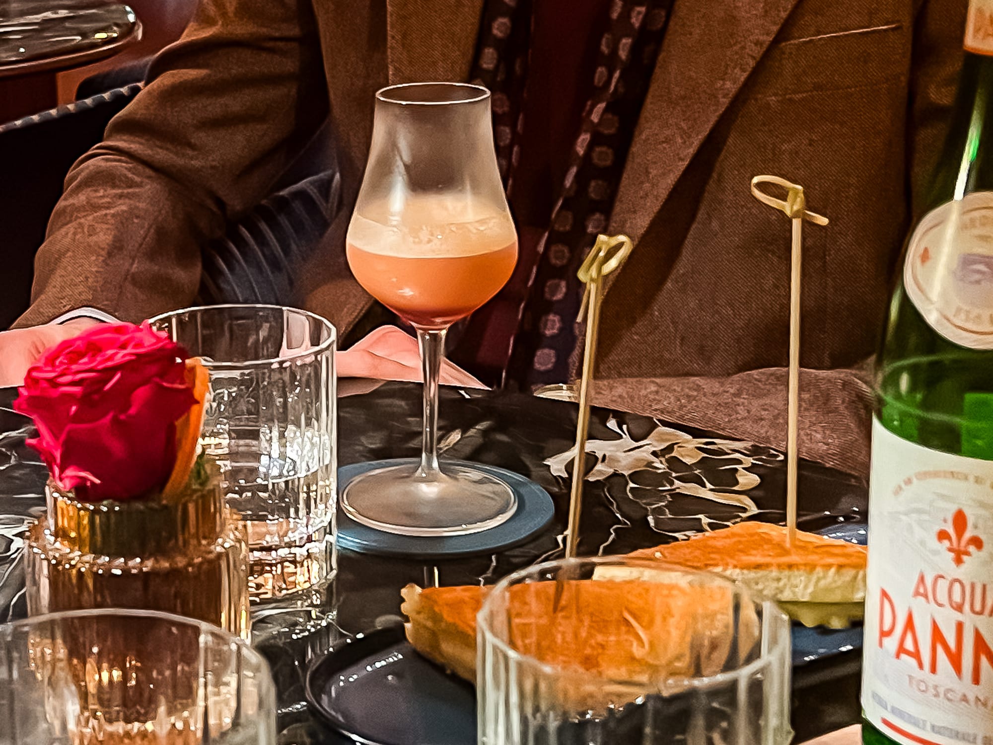 In unserem Fall war der erste Cocktail ein „Negroni Giacosa“, bestehend aus No.3 London Dry Gin, Martini Rubino, Campari und Carpano. Die Wahl eines klassischen und traditionellen Gins, kombiniert mit zwei der besten italienischen Wermutsorten und verfeinert durch klassischen Campari sorgt für einen ausgeglichenen Negroni mit viel Geschmack. Dazu gab es ein kleines Schiacciata alla Fiorentina als Fingerfood.